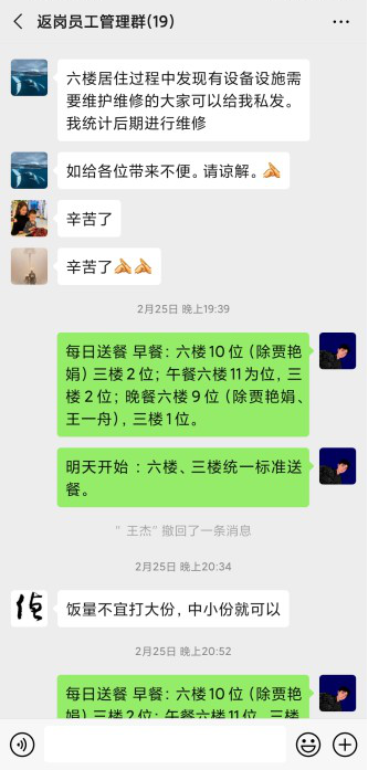 這是在新型能源神木分公司“返崗員工管理”微信群內,黨員賀虎和他的90后送餐小組們為返崗員工精心提供送餐和其他生活品需求配送服務的對話和通知。