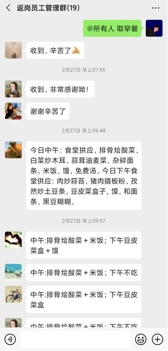 他們不但用微信等向他們推送每日三餐菜單,還調整了在崗職工的集中就餐時間,錯峰用餐。一方面組織返崗員工通過微信群做好網絡訂餐、送餐服務,讓員工在隔離宿舍也能吃到熱騰騰的飯菜。另一方面,保證了在崗職工的用餐安全。
