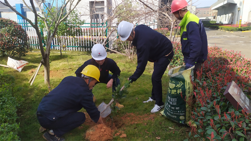 植樹現場,大家熱情高漲,配合默契,按照劃分好的區域,有序植樹。在有植樹經驗的師傅指導下,鏟土挖坑、澆水培土、踩土定植、忙而有序,干勁十足,忙得不亦樂乎。經過大家的一番努力,一棵棵樹苗迎風挺立,錯落有致,整個廠區生機盎然。(吳仙和)