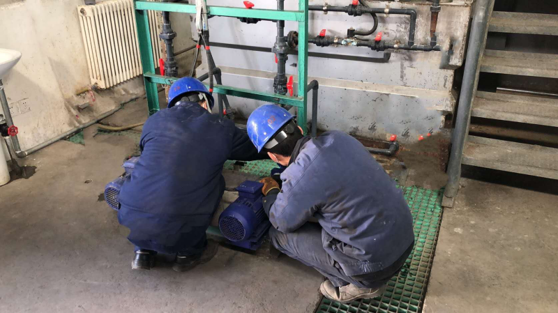 “誰有14#的扳手,快給我遞一下”,“你拿鉗子把下面的螺帽固定住,不要讓轉動”,此刻,檢修班的兄弟們正在更換污水治理一體化車間PAM藥品投加泵……