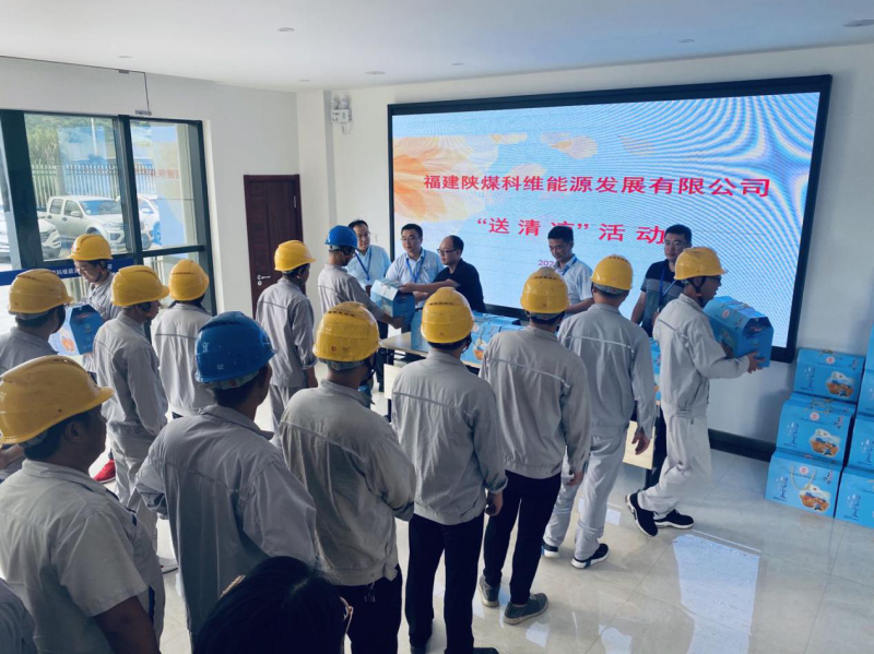 福建陜煤科維能源發展有限公司副總經理宋書銀、史克江將一箱箱來自陜西省扶貧辦及陜西省總工會出品的防暑降溫禮盒發放到各個員工手中,對員工表示親切問候,對大家的辛苦表示感謝,并叮囑一定要做好防暑降溫工作,為他們送去絲絲清涼,使他們感受到了來自公司的關懷,也更加體現出公司對員工的關愛之情,極大的鼓舞了員工士氣。(福建科維陳惠芬)
