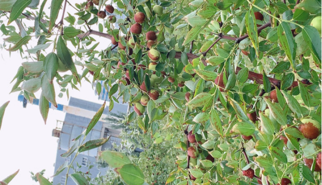 金秋十月,滿樹(shù)果實(shí)累累。紅通通的大棗壓彎了枝頭,看上去真饞人。下班后,三五成群的伙伴約伴去采摘,有全紅的、半紅半不紅的、深紅的、淡紅的、裂開(kāi)縫的、不裂開(kāi)縫的,隨便摘一個(gè)放進(jìn)嘴里,都亦如吃了蜜似的,越吃越愛(ài)吃。