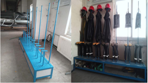 由他制作的防護用品擺放架全長2.4米,高1.7米,其中設(shè)置七組擺放架桿,可放置雨鞋、雨衣、安全帽、風(fēng)衣等防護用品,底層設(shè)計較大的儲存柜,可放置安全帶、安全繩、注油槍及常用檢修工器具等,具有分類多、儲存空間大、規(guī)范整潔的工藝特點。