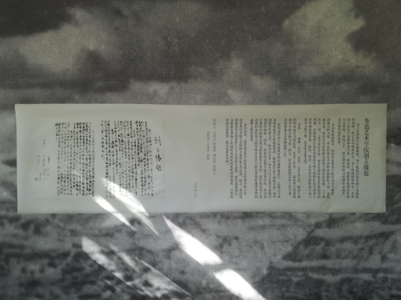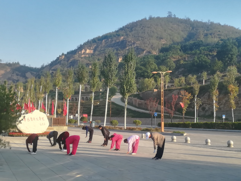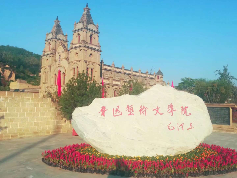 第二天的清晨八點左右,我來到了魯藝舊址的正大門。環繞四周,青翠的棗樹屹立在駱駝似的群山上。在大門外有一塊石雕矗立在花壇之中,一個練太極拳的老年團正在閉目養神。從陡峭的山坡放眼望去,一排排挺拔的白楊樹精氣十足,像是保衛魯藝舊址的士兵,神采奕奕。一排排鮮艷的五星紅旗在圍欄邊上作出了最優雅的姿勢。