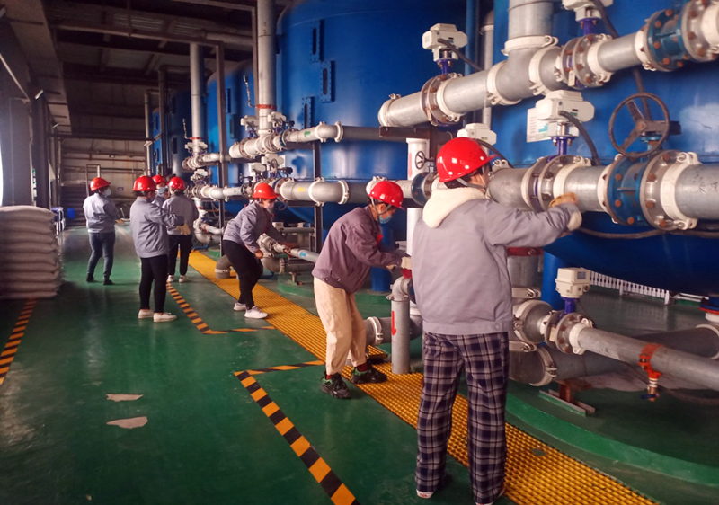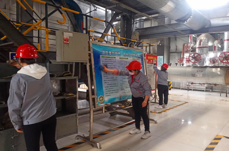 下午,大家準時在辦公室門前集合,佩戴好口罩、安全帽,拿著擦拭工具前往生產水處理間,對水處理設備進行全面擦拭。女職工們以高昂的熱情積極投入到勞動中;你脫外套,我卷衣袖,現(xiàn)場秩序井然有序,分工明確,抹布在手,大家干得如火如荼……