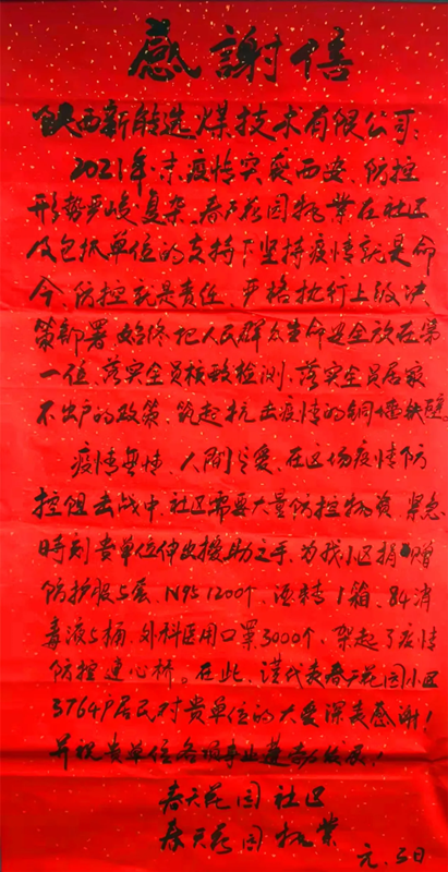 近日新型能源選煤公司收到兩封特殊的感謝信情真意切的信就像冬日里的暖陽事情雖然平凡而感動就是如此簡單。12月30日,新型能源選煤公司為長安住建局城南辦公室捐助了一批防疫物資。今日,長安住建局城南辦公室和春天花園社區給選煤公司發來感謝信,表示誠摯的謝意。